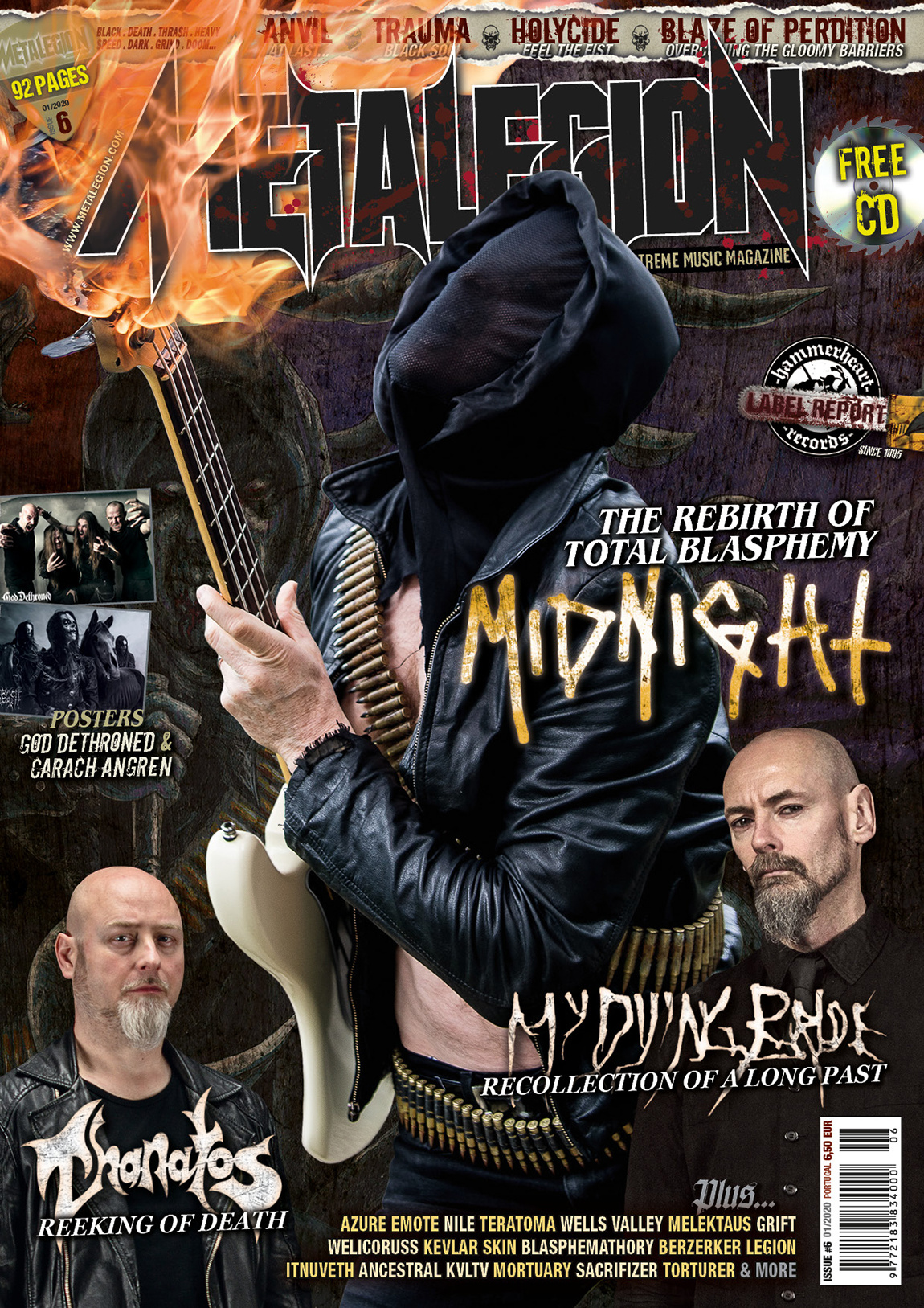 Highlights on this issue range from features with some of the top acts of the metal scene, like MIDNIGHT, THANATOS, MY DYING BRIDE, TRAUMA, ANVIL, BLAZE OF PERDITION or the avant-garde amazing act AZURE EMOTE but also covering underground gems like MELEKTAUS, SACRIFIZER, MORTUARY, TERATOMA, WELLSVALLEY or the uprising international super-group BERZERKER LEGION to state just a few.